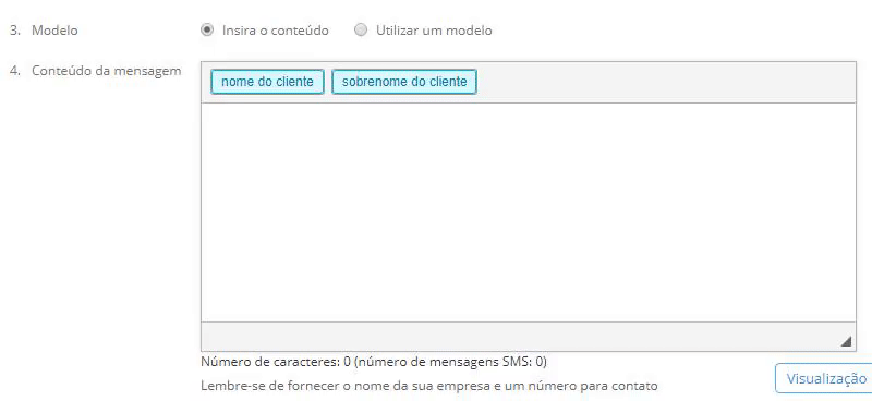 - Caso Você escolheu opção Insira o conteúdo lembre-se de incluir o nome do seu negócio e um número de contato! Além disso, tenha em mente que uma única mensagem de texto SMS contém 160 caracteres (Versum contará o número de caracteres em sua mensagem para você)